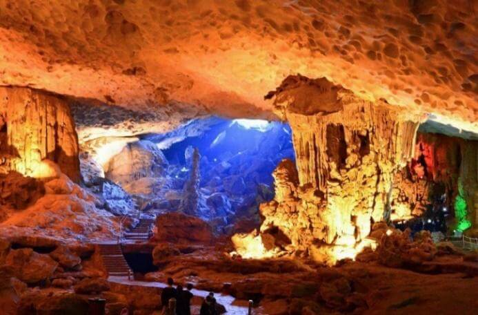 12:30: Quý khách dùng bữa cơm trưa và ngắm nhìn những dãy núi và phong cảnh thơ mộng, một kỳ quan thiên nhiên giữa đất trời bao la. 13:45: Quý khách thăm quan Hang Sửng Sốt - Một trong những hang động đẹp nhất Vịnh Hạ Long. Tiếp đó, tàu di chuyển đến Hang Luồn, du khách có thể chèo kayak/bè tre hoặc nghỉ tại tàu (khách nào không sử dụng dịch vụ này có thể ở lại trên tàu).